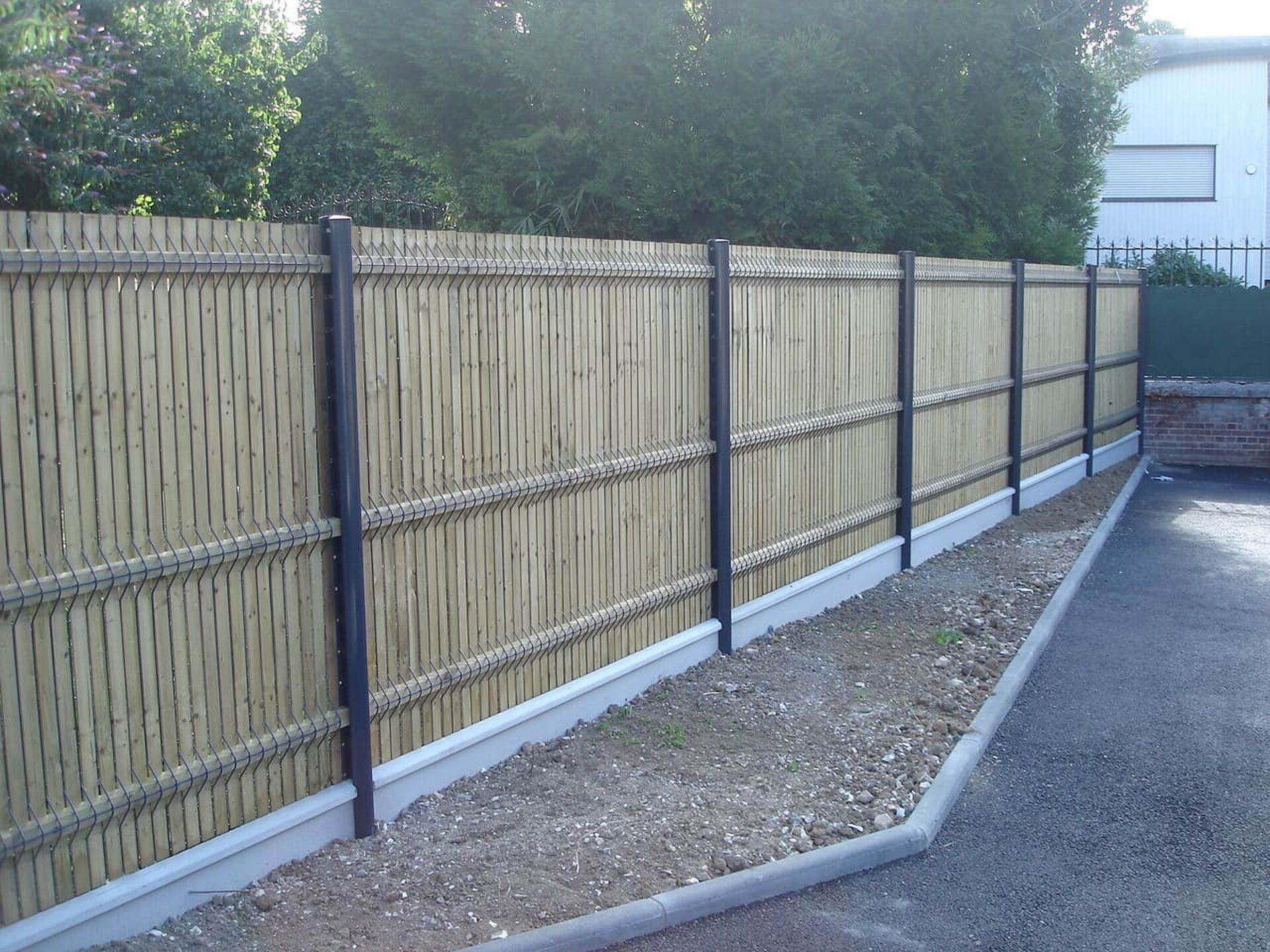 Cette clôture occultante mixte acier et bois offre un brise-vue efficace tout en apportant une esthétique contemporaine à vos espaces verts.